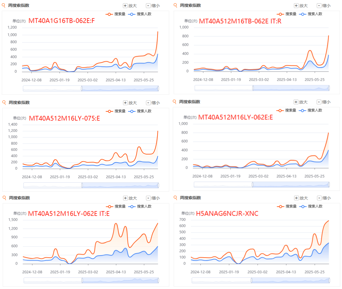 变化如上述两个型号的DDR4内存型号还有多个,其中美光品牌居多,且包含以IT尾缀的工业级温标版本(-40至95℃)。除此之外,SK海力士品牌中也有热度大幅增长的DDR4物料,趋势与上述美光与三星物料同步。另外值得注意的是,这些DRAM物料在4-5月间就有一波热度增长,其搜索量普遍超过之前的平均水平,这反映了当时已经出现DDR4供应缩减预期,同时再叠加关税等不确定预期,应用端就此产生备货需求。