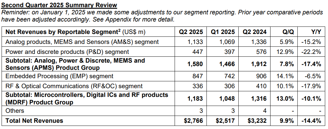 7月下旬,模拟芯片与MCU领域的三大原厂——德州仪器(TI)、意法半导体(ST)与恩智浦(NXP)相继交出2025年第二季度的财报,通过这些客观数据,现在终于可以总览IC行业上半年的表现。