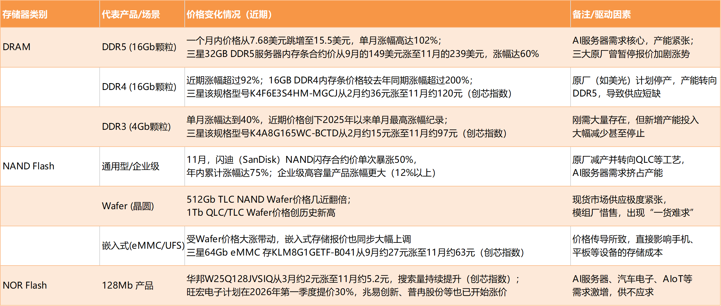 近期存储器涨价行情汇总 来源:公开报道综合、创芯指数价格信息 点击表格放大查看