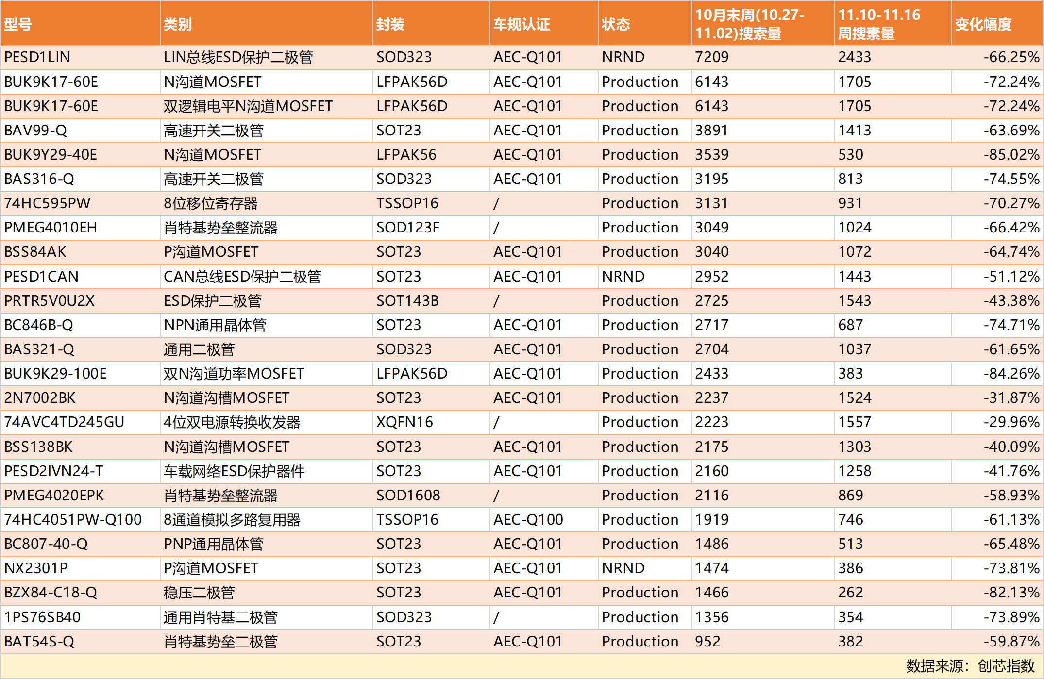 以上表单列举近期热门安世半导体物料的搜索量变化数据。从中可见车规级物料占绝大多数,这些型号在10月末的搜索量达到峰值,凸显当时供应链的急迫状态,也体现出低物料库存的“精益生产”模式在彰显经济原则的同时,也会放大供应链的风险和脆弱性。